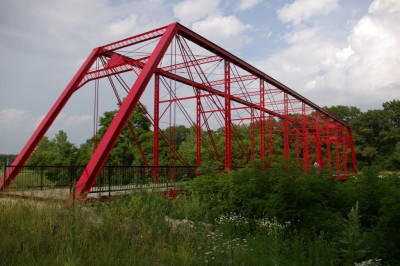 The old Centerline Bridge (sometimes called the Charlotte Bridge) was located where the Charlotte Road crosses the Grand River, South of Portland. The bridge was built in 1886, by the Buckeye Bridge Company and replaced in 2001. The old bridge was a Whipple Truss Bridge, originally built to carry horse and wagon traffic and later modified to carry one lane auto traffic. Whichever vehicle reached the bridge first had the right-of-way. The bridge was 177 foot long and the deck was 15 foot above the river. The height at the top of the trusses is unknown but perhaps 25 foot above the water?